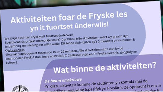 The team of the EU Erasmus+ programme-funded OWL+ project is looking for secondary school teachers of Frisian. Would you like to participate in the project? There are three activities, about which the team would like to know your experience and opinion. These are activities developed within the project 'Ownership and Leadership: Pathways for (Endangered) Languages' Use in School' (short: OWL+ ). They involve describing a natural object (such as a tree) and activities on Frisian history and Frisian literature.