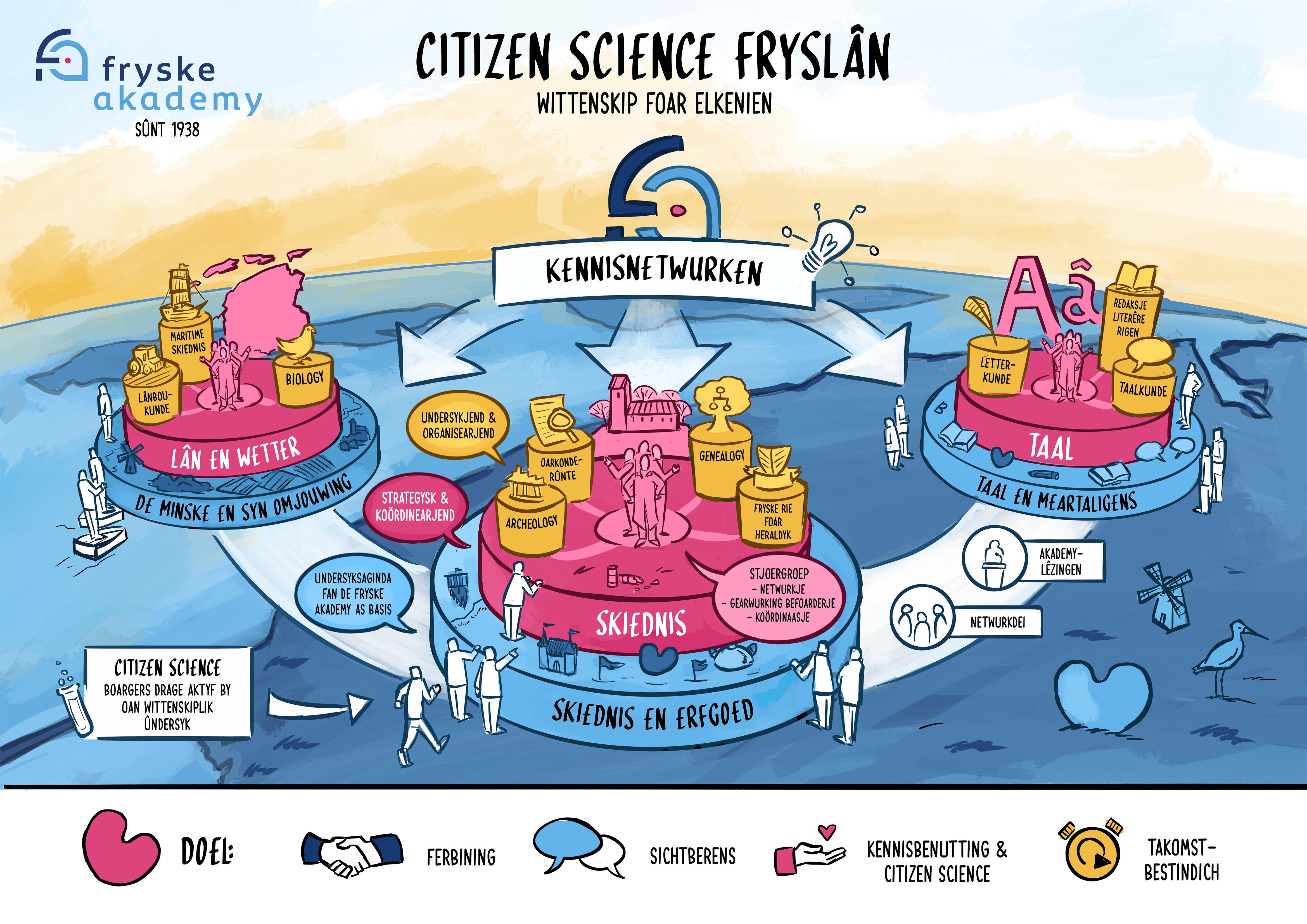 De poster lit sjen hoe’t de Fryske Akademy tawurkje wol nei in breed netwurk foar citizen science. Dit netwurk wurdt opdield yn trije kennisnetwurken dy’t tematysk oanslute op de ûndersyksaginda fan de Fryske Akademy. Yn elts kennisnetwurk kinne ferskate tema- en projektgroepen ûntstean, dy’t tegearre wurkje oan it ûntwikkeljen en dielen fan wittenskiplike kennis mei de Fryske mienskip. Sa ûntstiet der in dynamysk gehiel wêr’t maatskiplike fragen in plak krije en wêr’t ympulsen foar nije projekten út fuortkomme kinne.